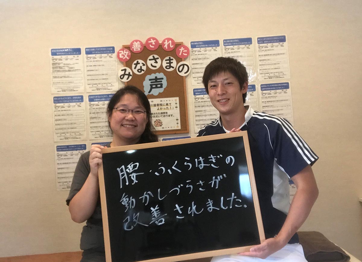 初診の時に自分の腰痛の原因を教えていただき、そのために必要な施術や通院期間も教えていただきました。また、先生全員が国家資格を持っている為説明もわかりやすく、施術も安心して受けることが出来ました。通院を続けていくにつれて今では痛みが軽減し、寝返りや走ることもできるようになり日常生活が楽になってきました。